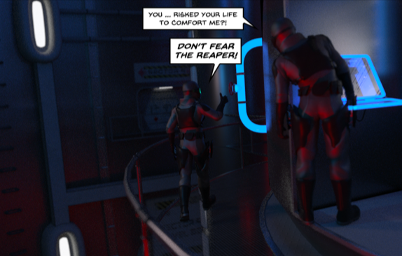 I know what you mean, having the lowest-of-the-low henchmen mercenary type people be wonderful to each other is a bit special/unusual. I put it in the comic because the role of hope in the darkest places is really crucial, and the things we say to each other (even when we don’t know each others’ full stories) is vital – words being more powerful than we probably think.